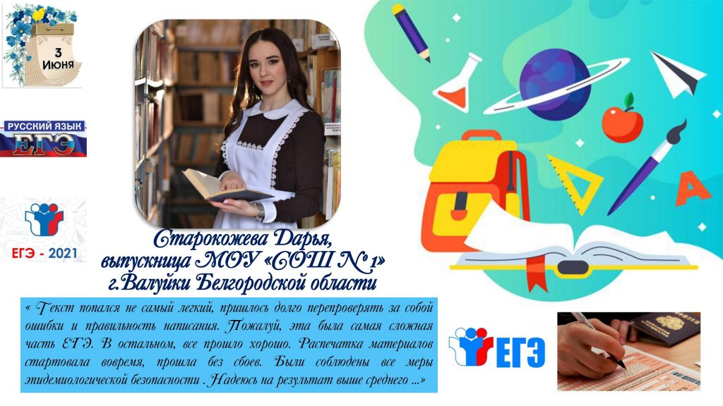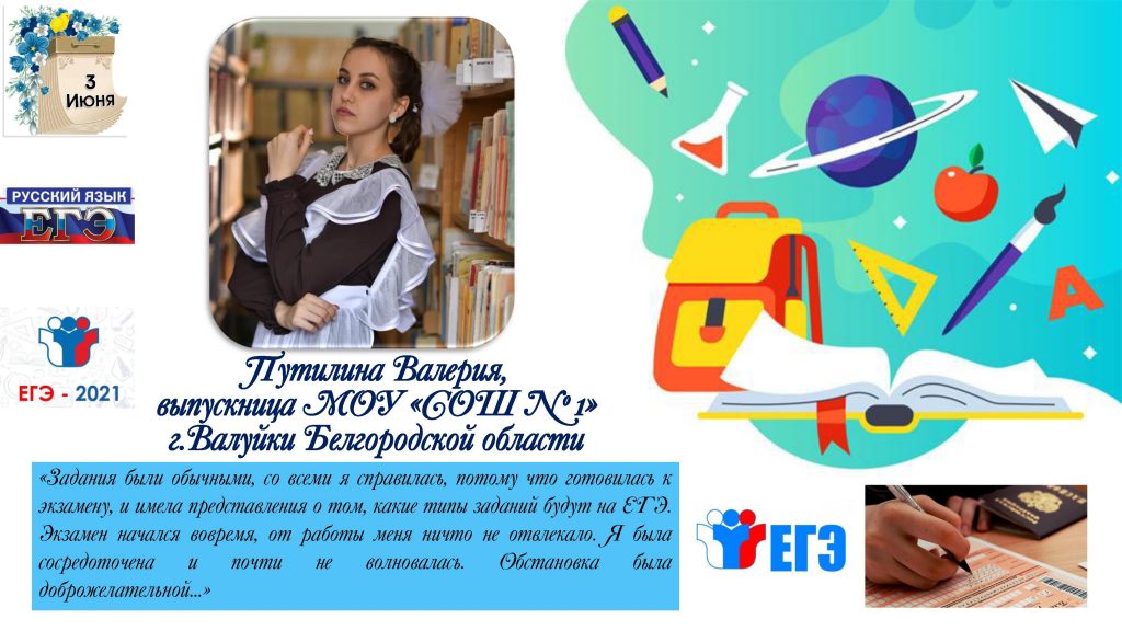 «Конечно же, переживаю, потому что сдаю обязательный экзамен. Но настрой у меня очень боевой. Даю себе внутреннюю установку: я всё сдам, я всё смогу! Этот предмет мы изучали на протяжении 11 лет, дополнительно занимались на консультациях по предмету, поэтому просто обязаны показать достойные результаты!», говорит Маргарита Цан, выпускница СОШ № 1 г. Новый Оскол.