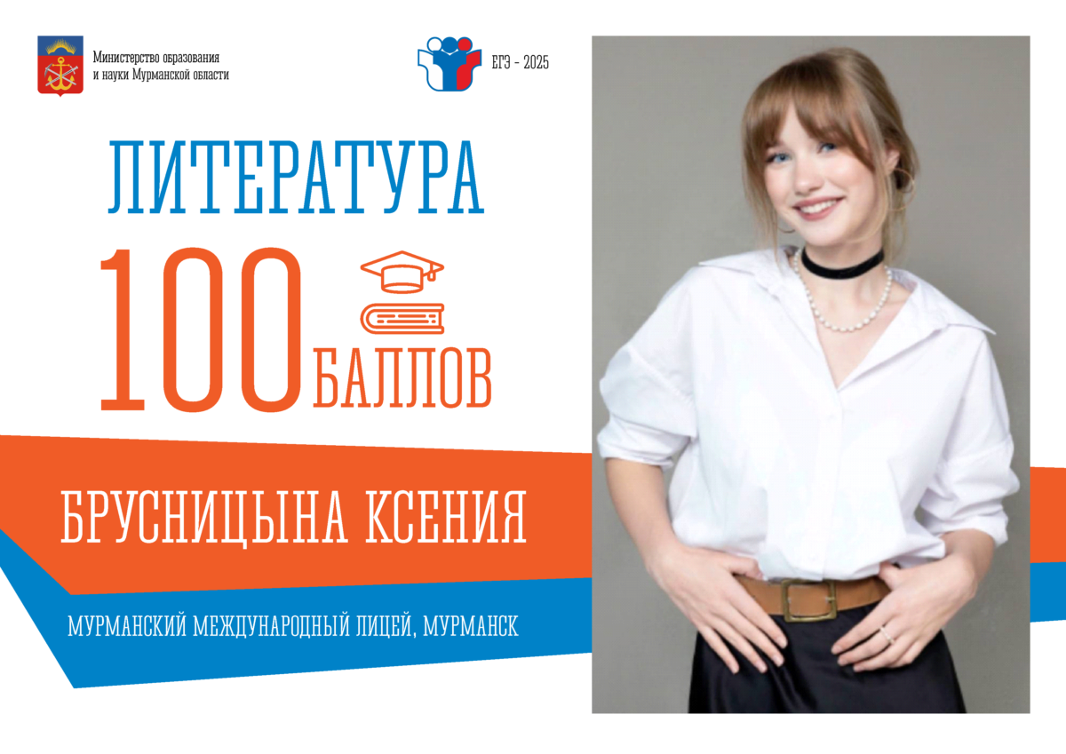 14 июля 2025 г.Ксения Брусницына окончила Мурманский международный лицей. Серьезно занималась гуманитарными предметами, и результат единого государственного экзамена по литературе тому подтверждение - 100 баллов. Девушка активно ...