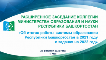 1 марта 2022 г.25 февраля в Уфе состоялось расширенное заседание коллегии Министерства образования и науки Республики Башкортостан. В рамках заседания коллегии подведены итоги деятельности системы образования Башкортостана за 2021 г...