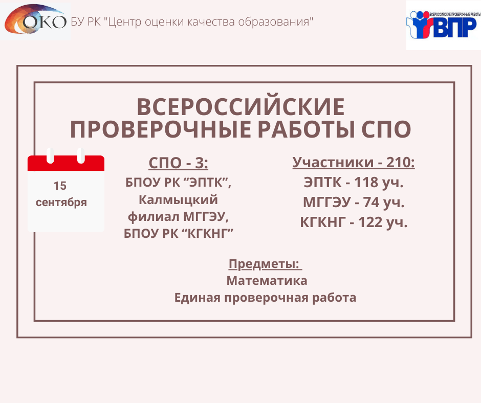 18 сентября 2023 г.Согласно письму Рособрнадзора во всех субъектах Российской Федерации проходят всероссийские проверочные работы для обучающихся по образовательным программам среднего профессионального образования в следующие сроки – с...
