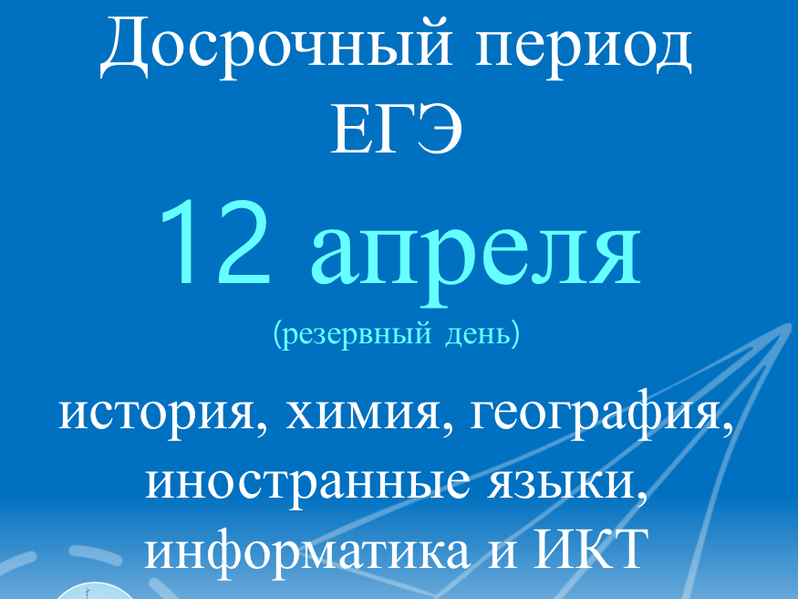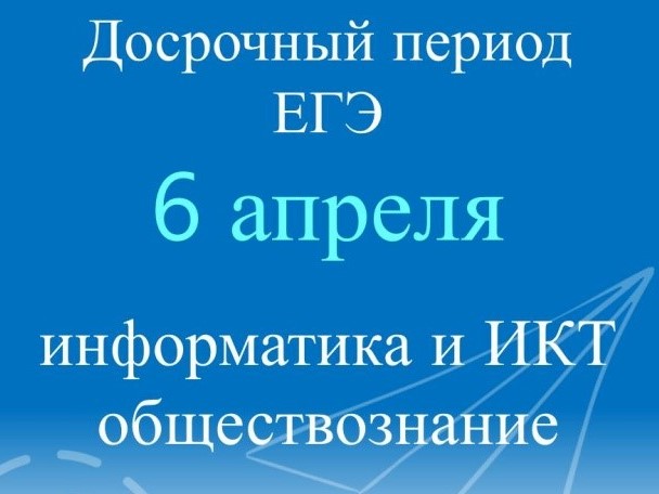 6 апреля 2023 г.6 апреля проводится досрочный единый государственный экзамен (ЕГЭ) по информатике и информационно-коммуникационным технологиям (в компьютерной форме), а также по обществознанию. Экзамен проходит в семи общеобразова...