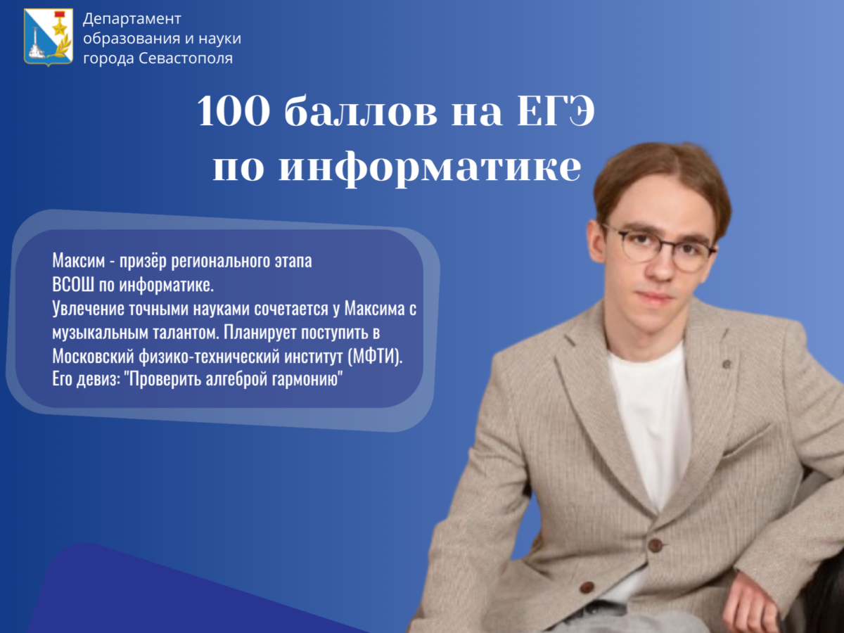 26 июня 2025 г.Севастопольские выпускники снова радуют отличными результатами ЕГЭ. Блестящий результат на экзамене по информатике показал Максим Дружкин, выпускник билингвальной гимназии № 2», получив максимальный балл – 100 балл...